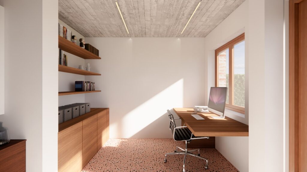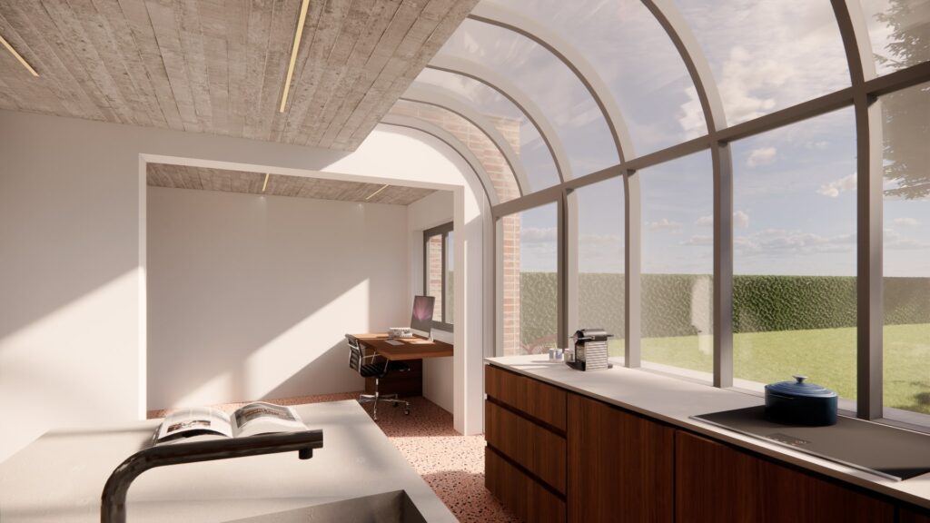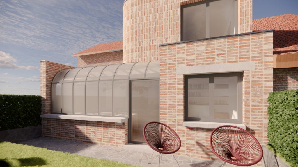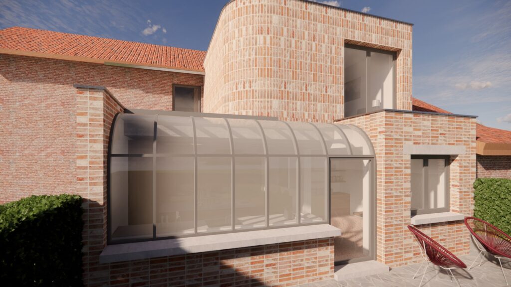 This renovation project elegantly transforms a traditional single-family house into a comfortable home while preserving its classic charm. The new extension, characterized by its curved edges, subtly distinguishes the contemporary addition from the original structure. The design features a striking blend of exposed brickwork and sleek glass elements, creating a harmonious fusion of old and new. A distinctive curved window, inspired by the 'serre style' typical of the Druivenstreek region, adds a unique touch.